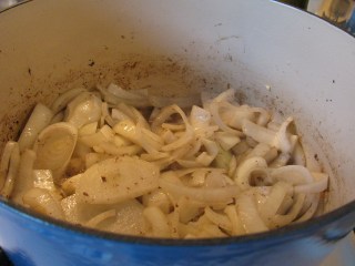 To the onions, add the sautéed lamb its juices that have accumulated while resting. Stir thoroughly. Add carrots, sautéed mushrooms, thyme, salt and freshly ground pepper to taste and stir thoroughly. Set burner to low simmer and add more wine — 1/4 to 1/2 cup.