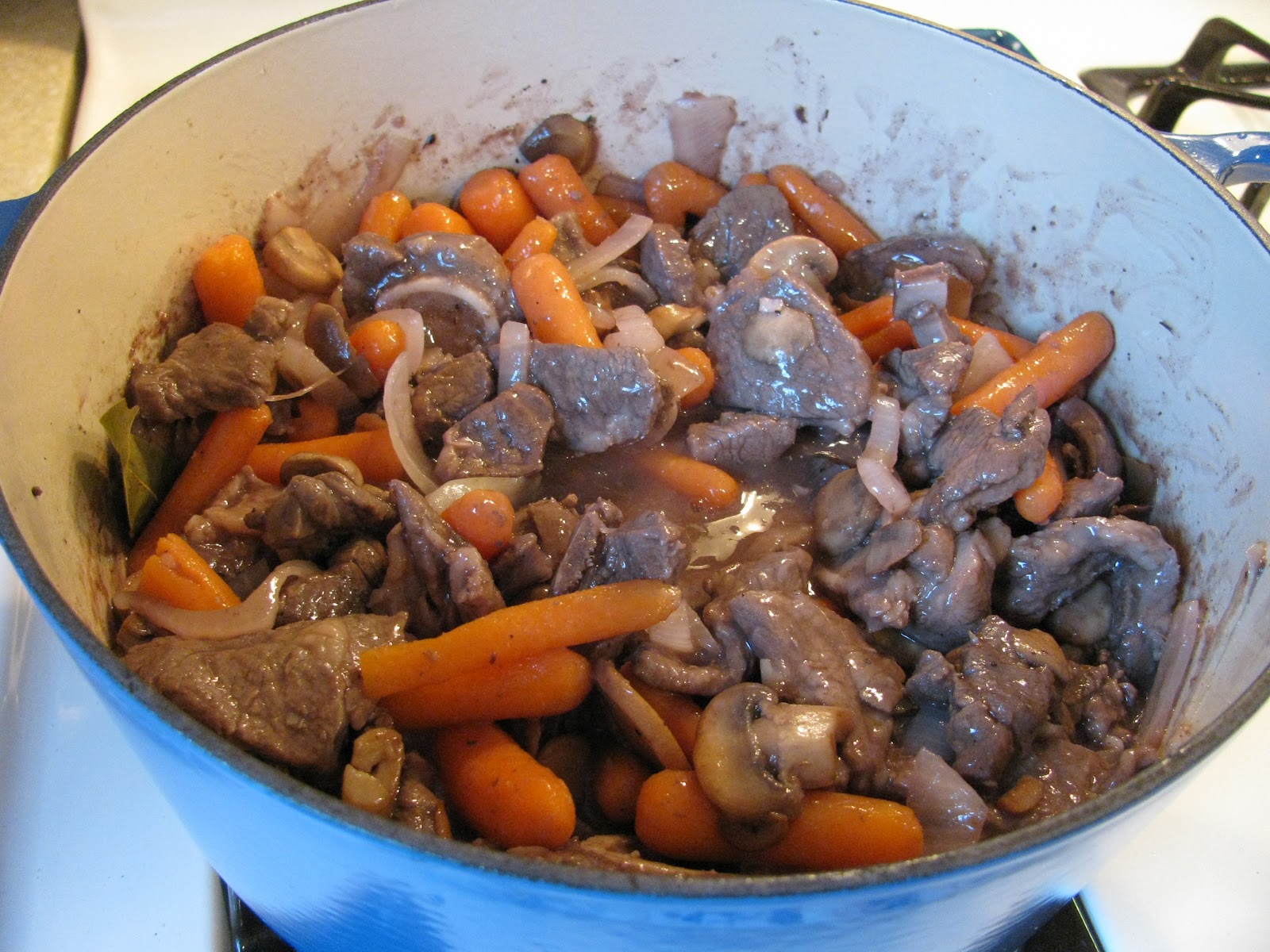 To the onions, add the sautéed lamb its juices that have accumulated while resting. Stir thoroughly. Add carrots, sautéed mushrooms, thyme, salt and freshly ground pepper to taste and stir thoroughly. Set burner to low simmer and add more wine — 1/4 to 1/2 cup.