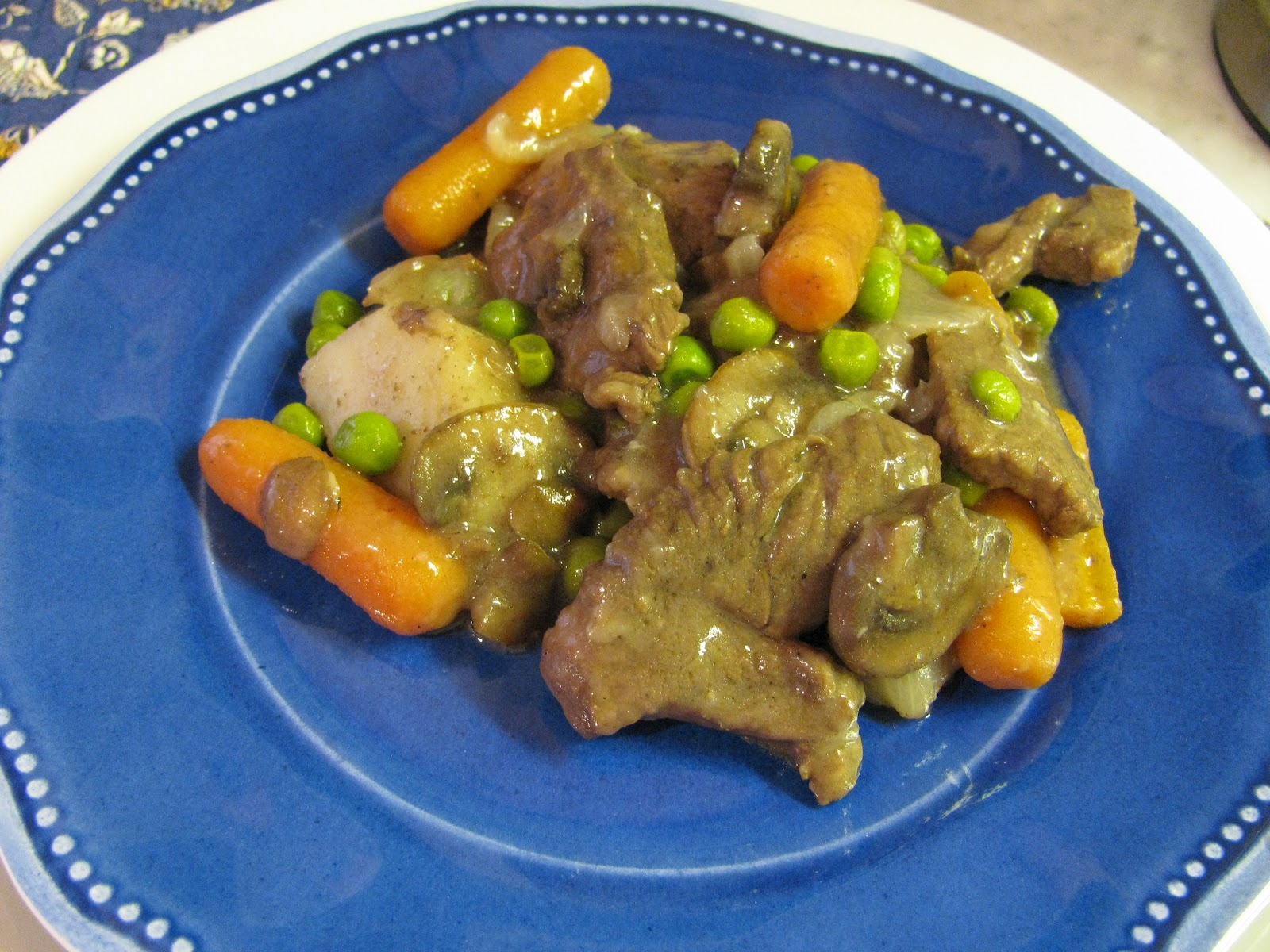 Stir thoroughly every 10-15 minutes, for 1-1/2 to 2 hours. Add more water or wine as needed. Add potatoes and let simmer for 15 minutes. Add frozen peas, simmer for 15 minutes more. Voila! It’s ready! Serve with a hearty Burgundy and French bread and don’t forget to offer seconds!