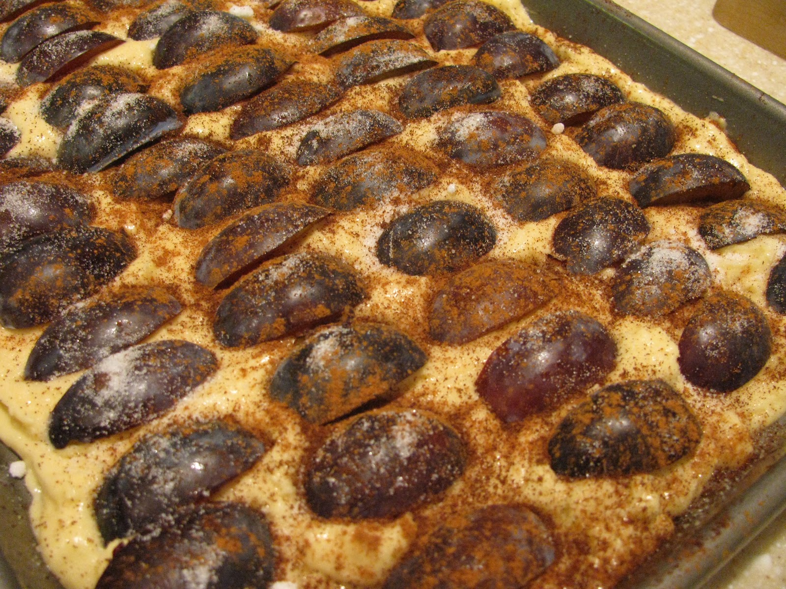 8. Place plums on top of sheet, sprinkle with cinnamon, ground cloves and sanding/granulated sugar.