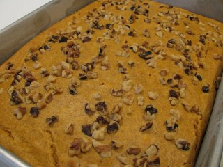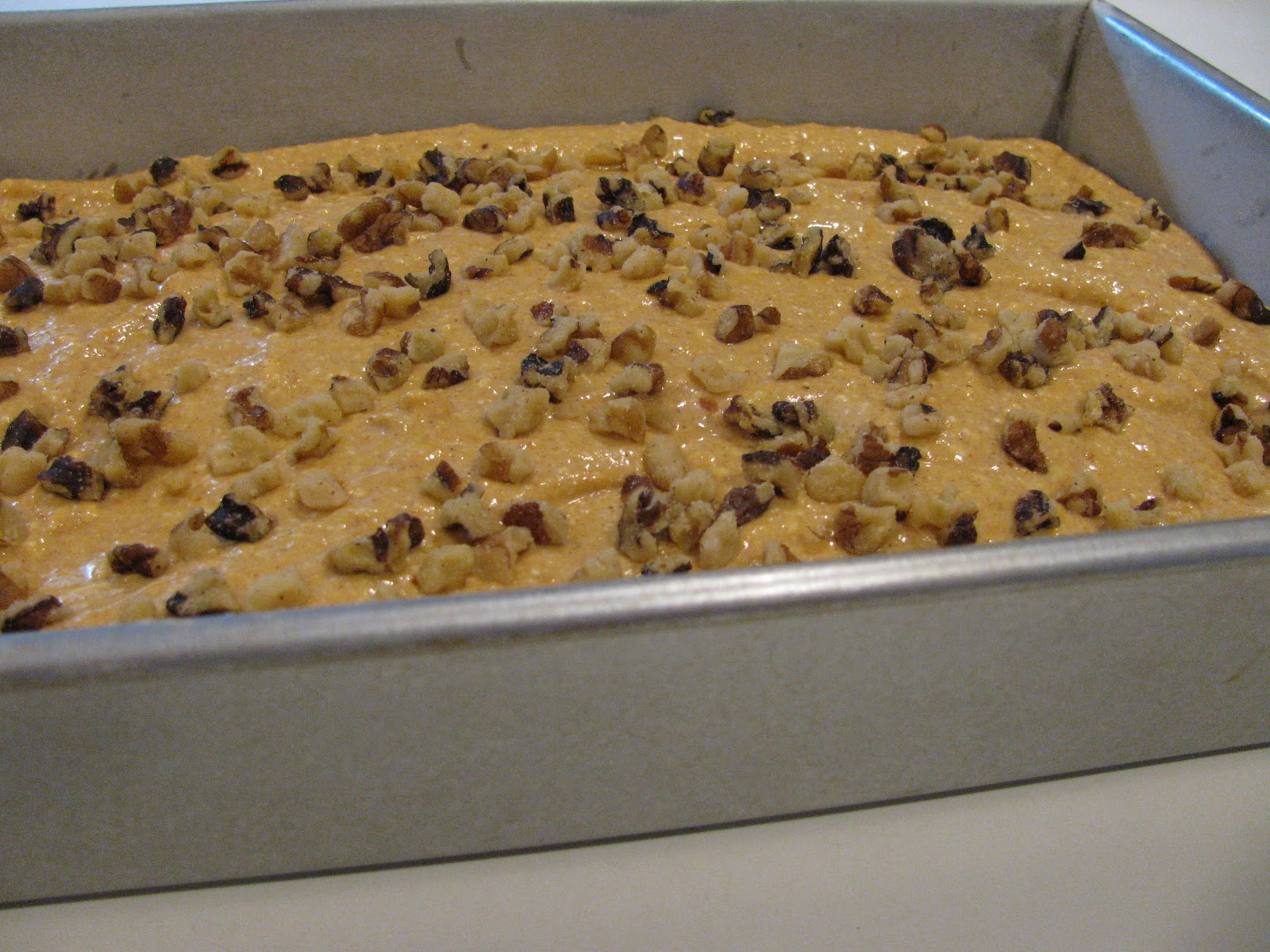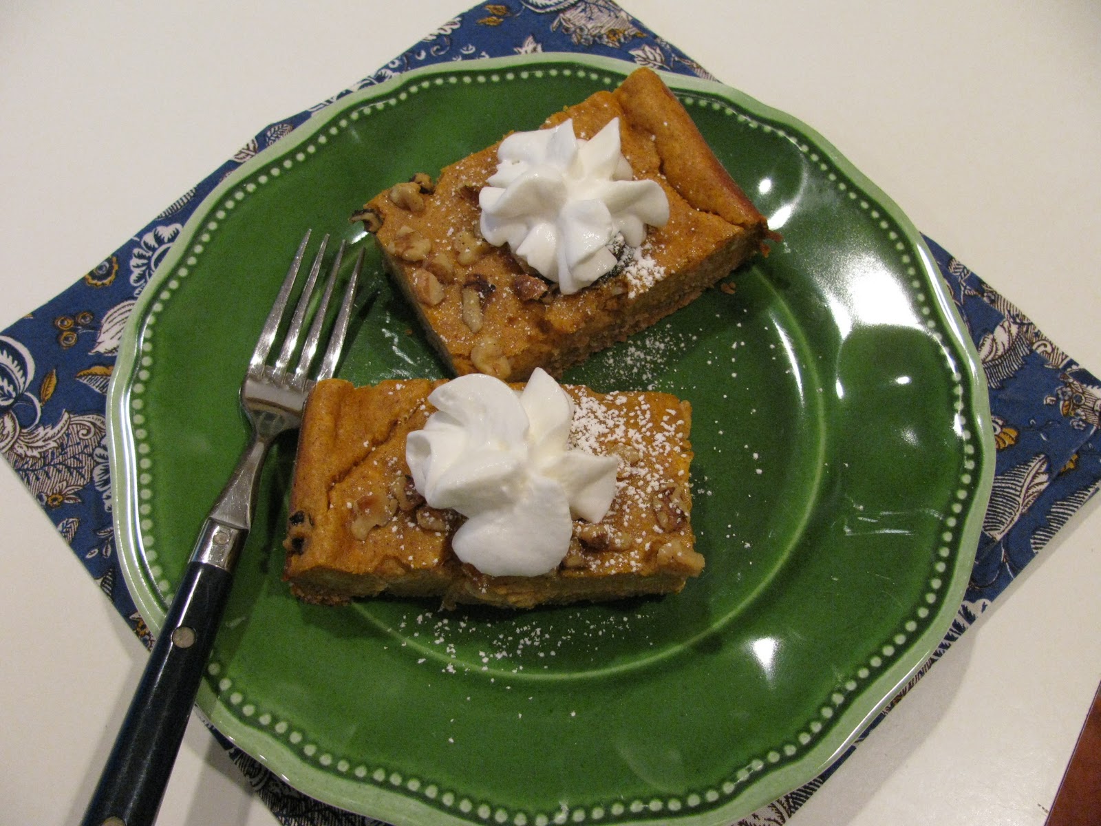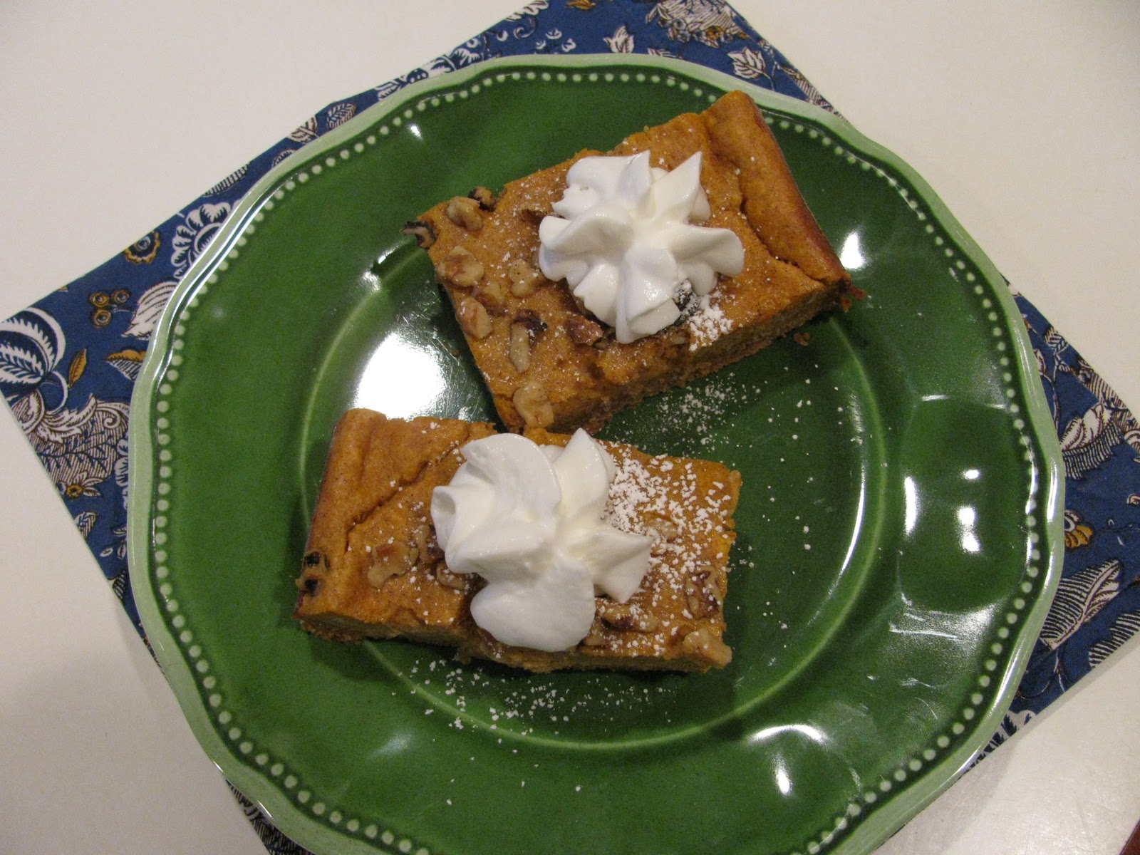 A pumpkin for your thoughts! Pumpkin is such a wonderful food, so loaded with health benefits, and available throughout the year, that it’s a wonder we don’t eat it more. Now, during this season of pumpkin pies, pumpkin ice cream and pumpkin casseroles, I pulled out an old favorite of mine from many years ago and decided to give it a few new twists by adding ground cloves and allspice. The result was “Pumpkin Party Squares,” great for a buffet dessert because, like brownies, they need no forks or spoons to eat them …. unless, of course, you put a dollop of freshly-whipped heavy cream on them, as I did, or vanilla ice cream. The result is a sumptuous dessert and is a real treat on a cold October or November night. A great gift for your Thanksgiving hostess, too!
