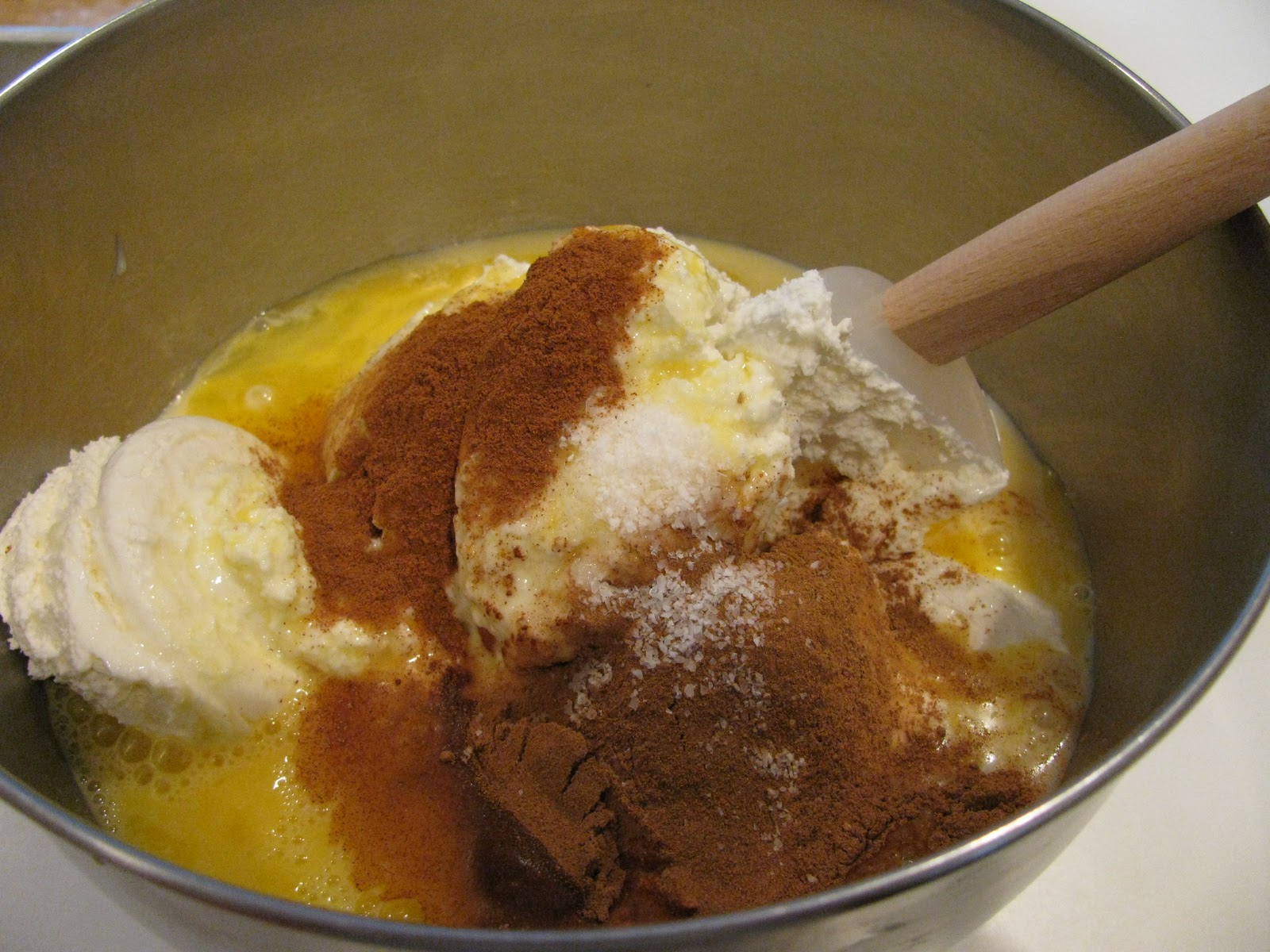(4) Add dry ingredients — pumpkin pie spice, salt, cinnamon — and stir to combine.