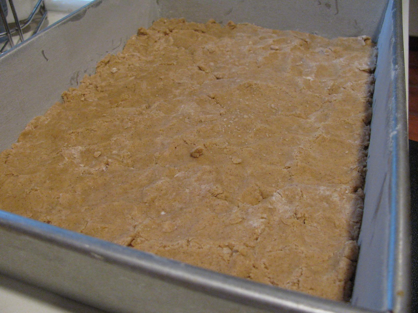 (2) Mix crust ingredients in bowl and press into a lightly greased and floured 13″ x 9″ baking pan. Mixture will be crumbly but firm.