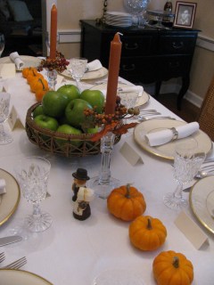 Here’s a suggested table setting, with mini pumpkins and Granny Smith apples for color: