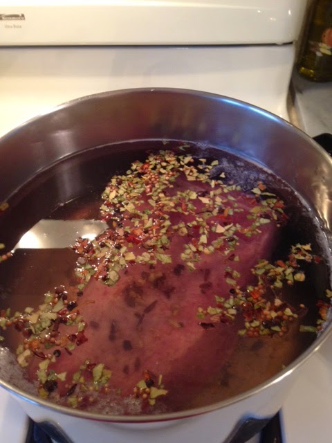 | Corned beef simmering in large pot of water with pickling spices (recipe below). |